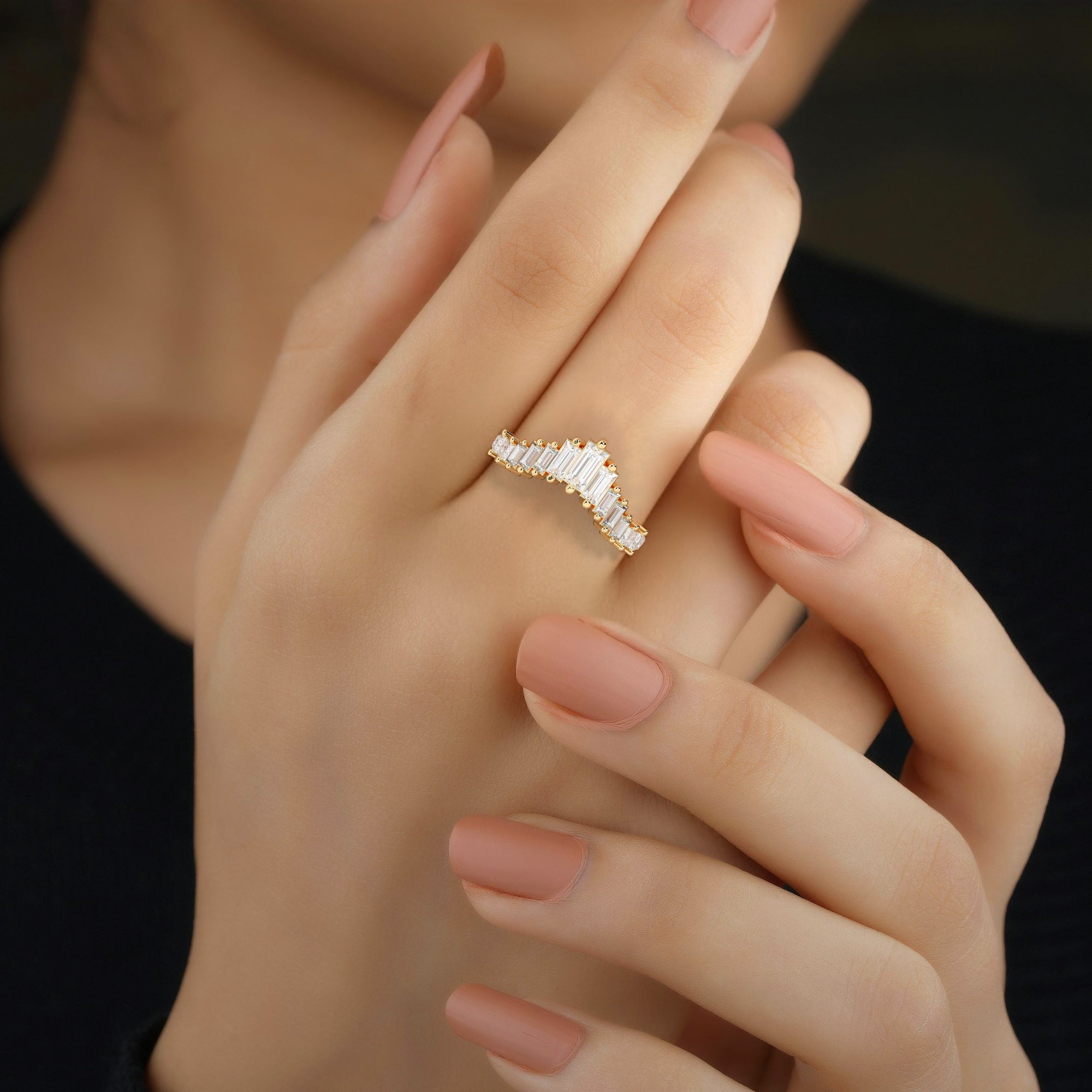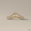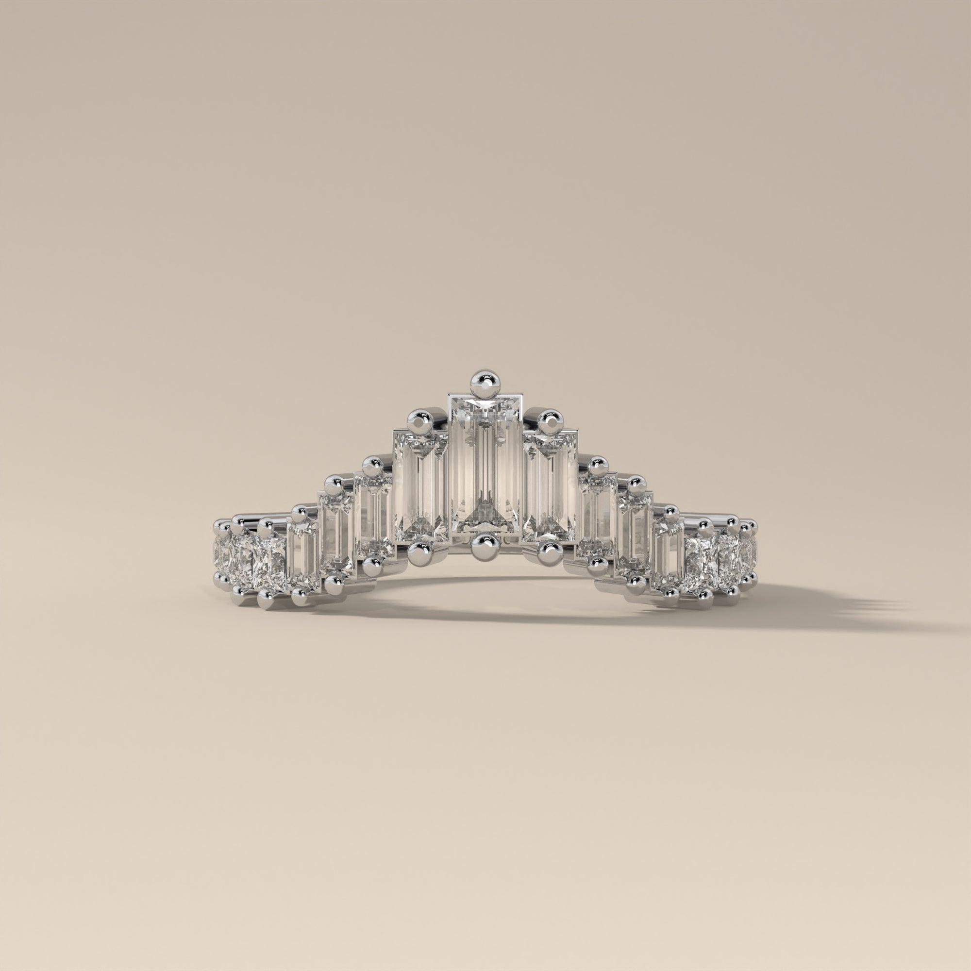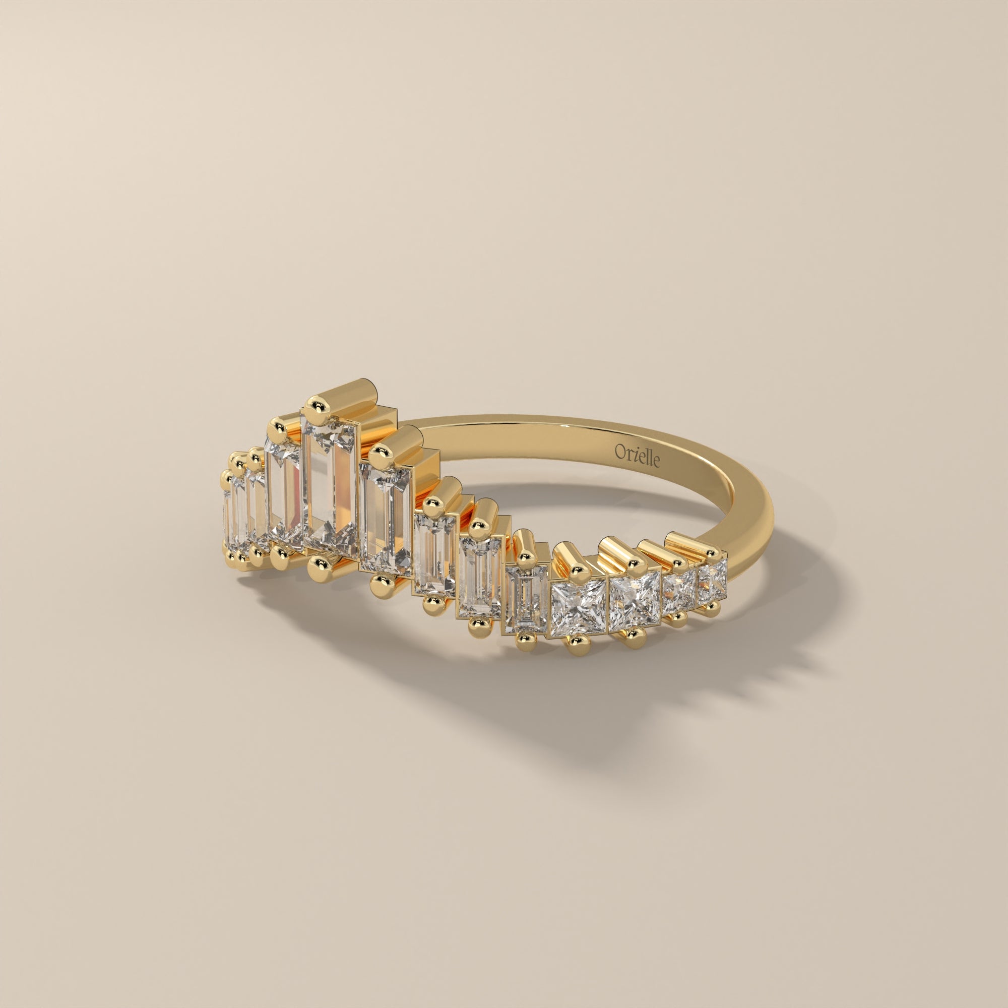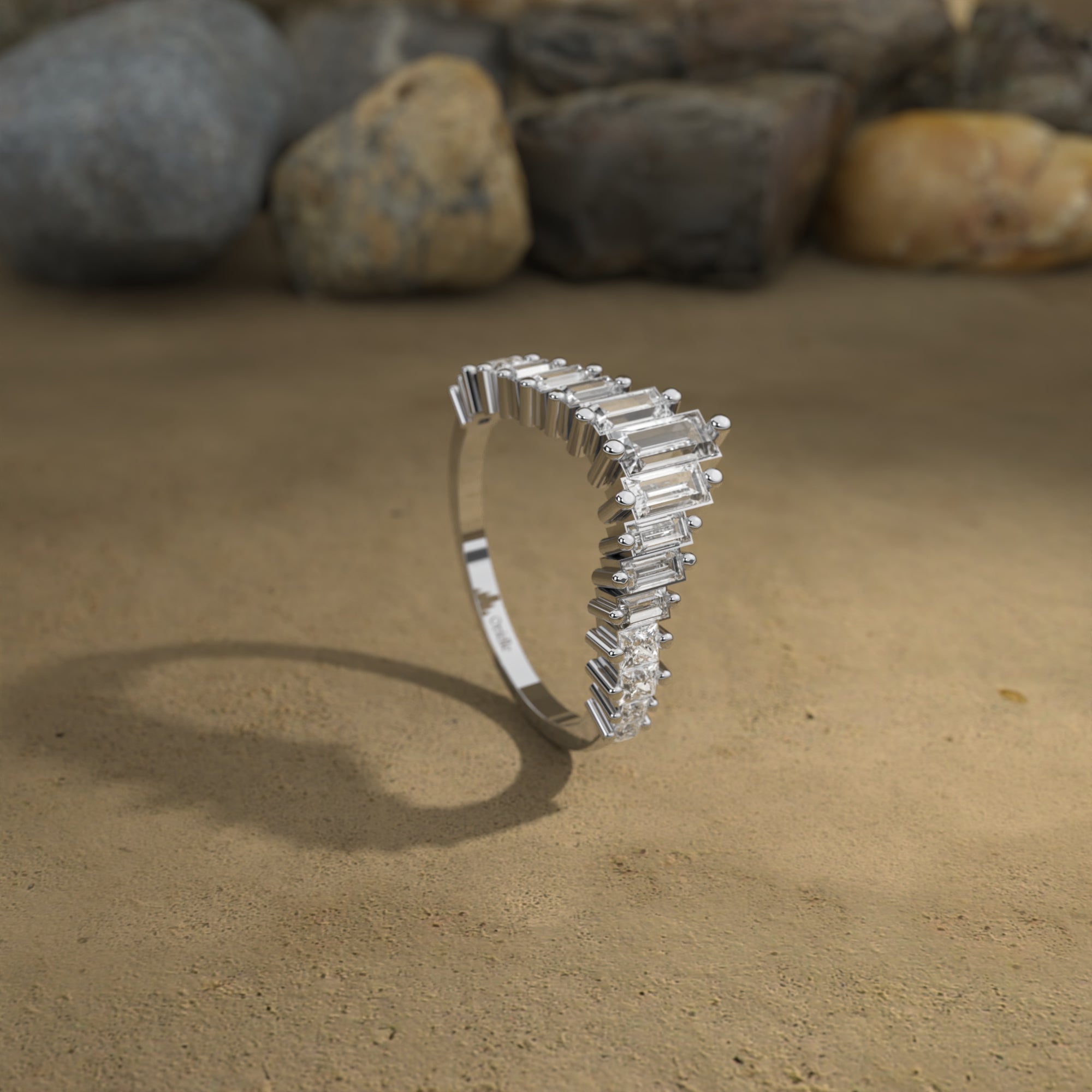 A captivating rise of baguette cut moissanites forms a sleek stepped design that catches the light with every movement. Set in solid gold, the clean geometric lines lend a modern, sculptural feel. Ideal for stacking or wearing alone, it adds effortless sophistication to any jewellery collection. A refined piece for lovers of contemporary elegance.
