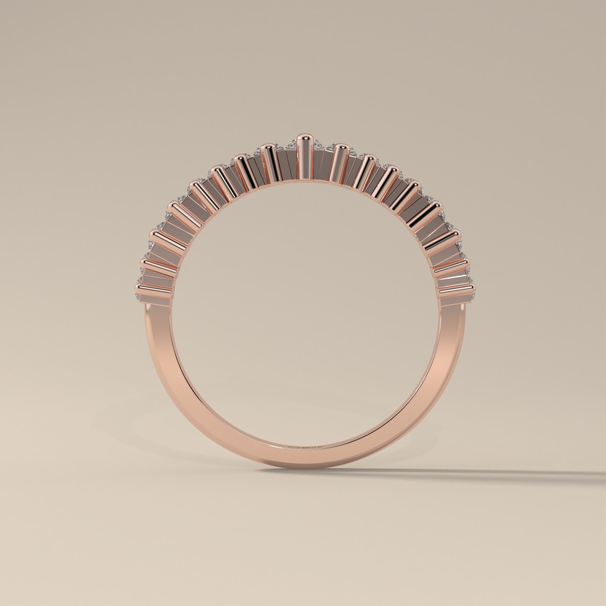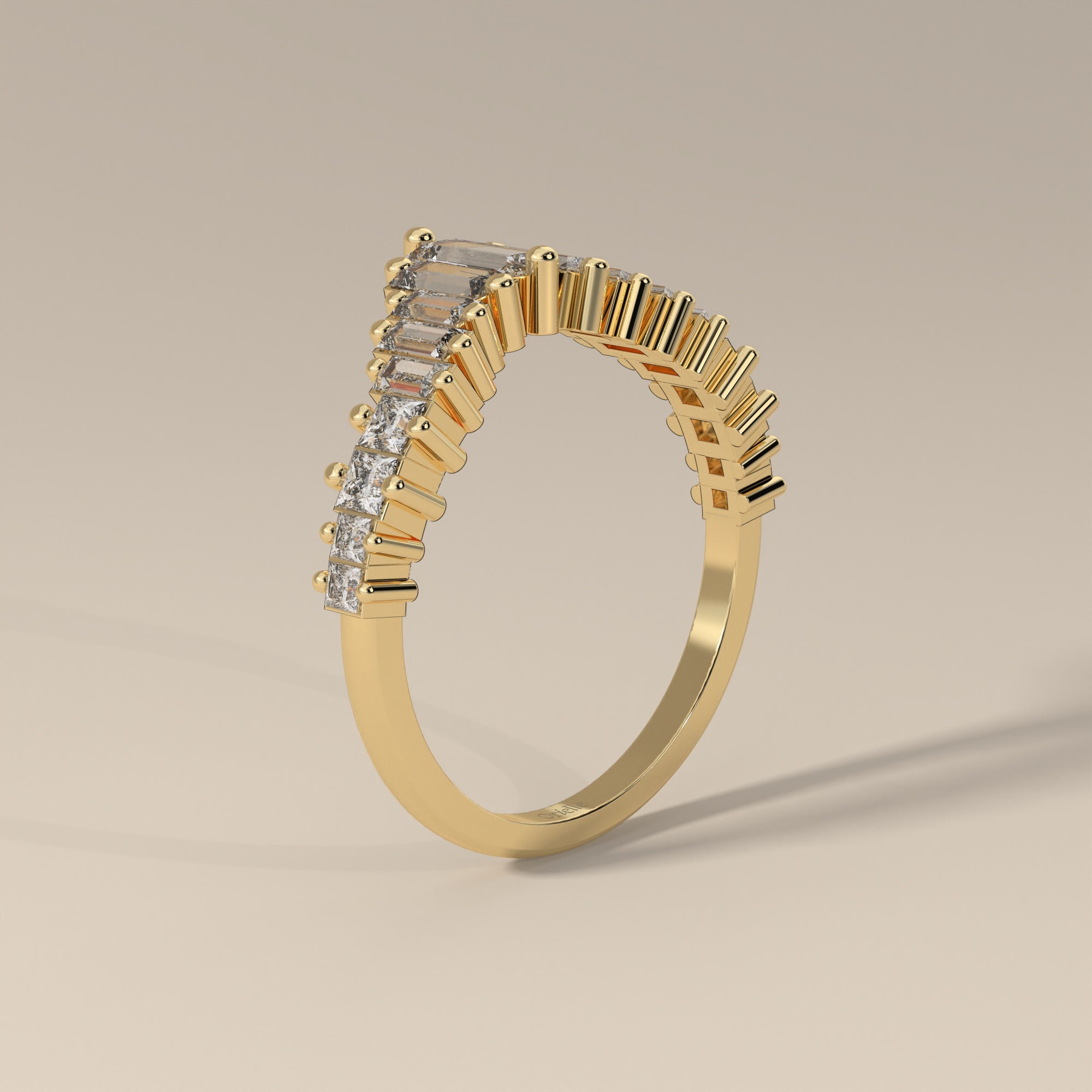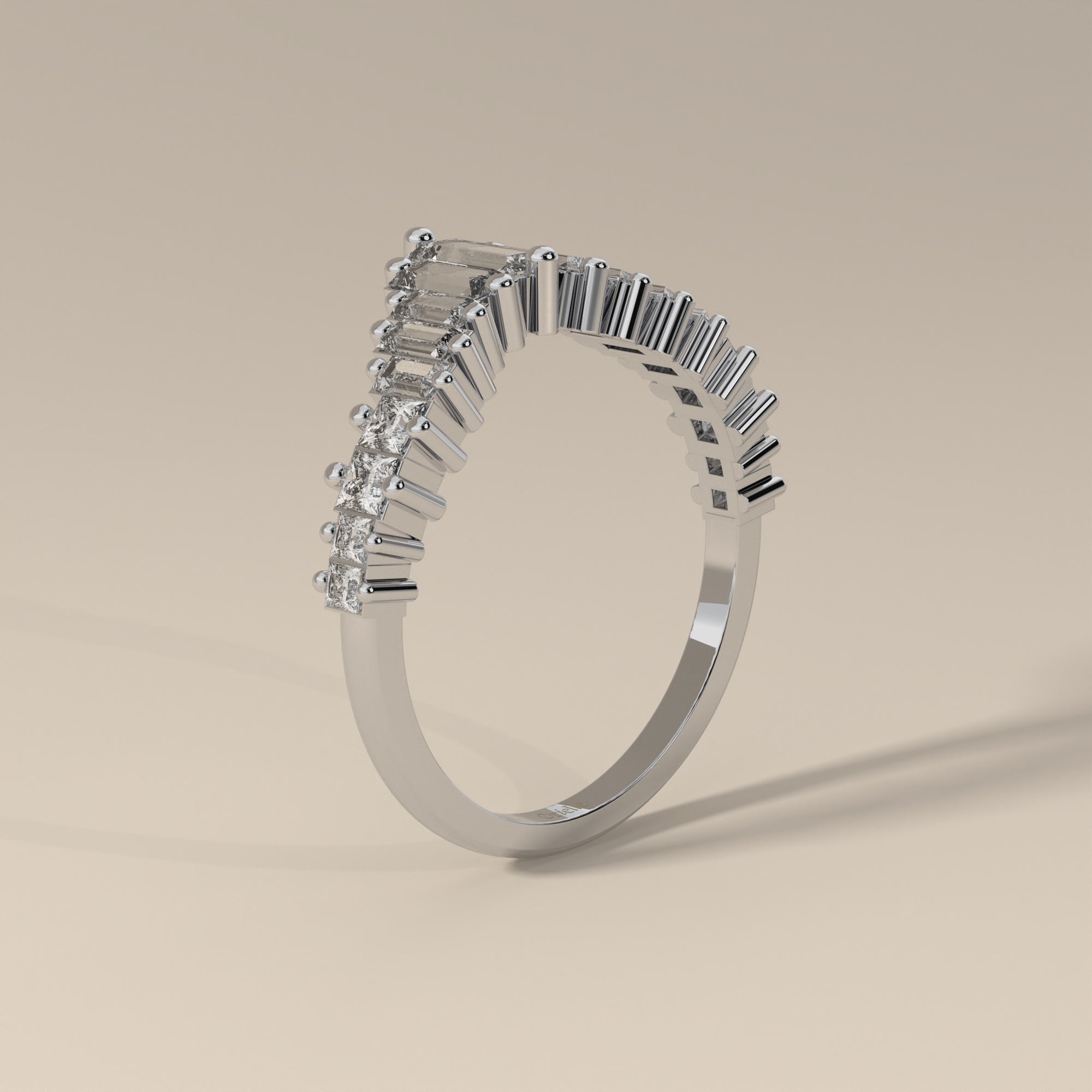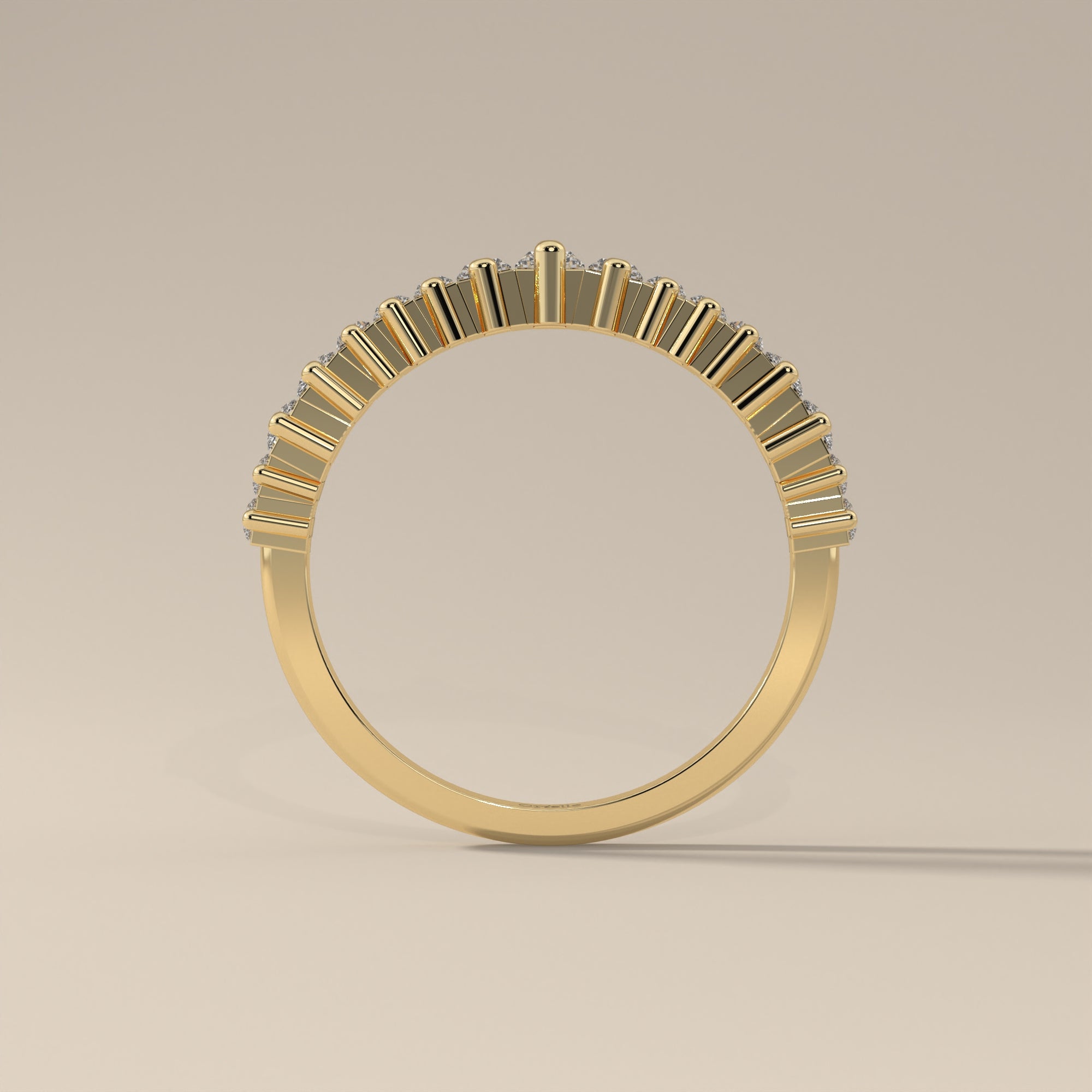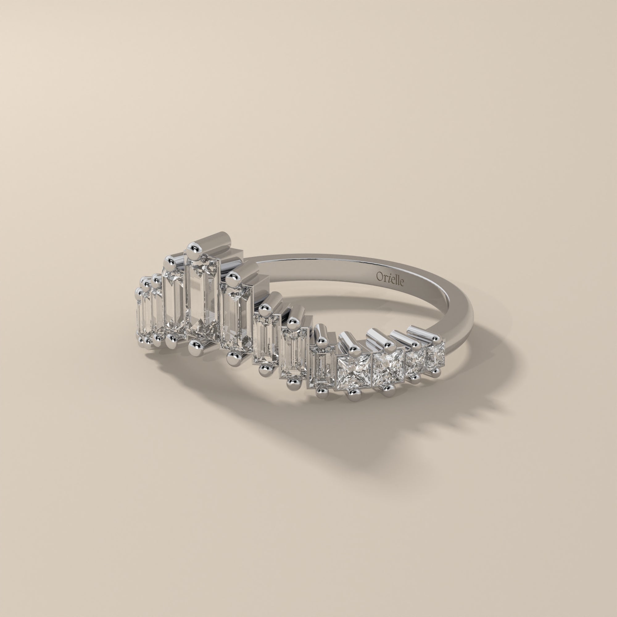 A captivating rise of baguette cut moissanites forms a sleek stepped design that catches the light with every movement. Set in solid gold, the clean geometric lines lend a modern, sculptural feel. Ideal for stacking or wearing alone, it adds effortless sophistication to any jewellery collection. A refined piece for lovers of contemporary elegance.