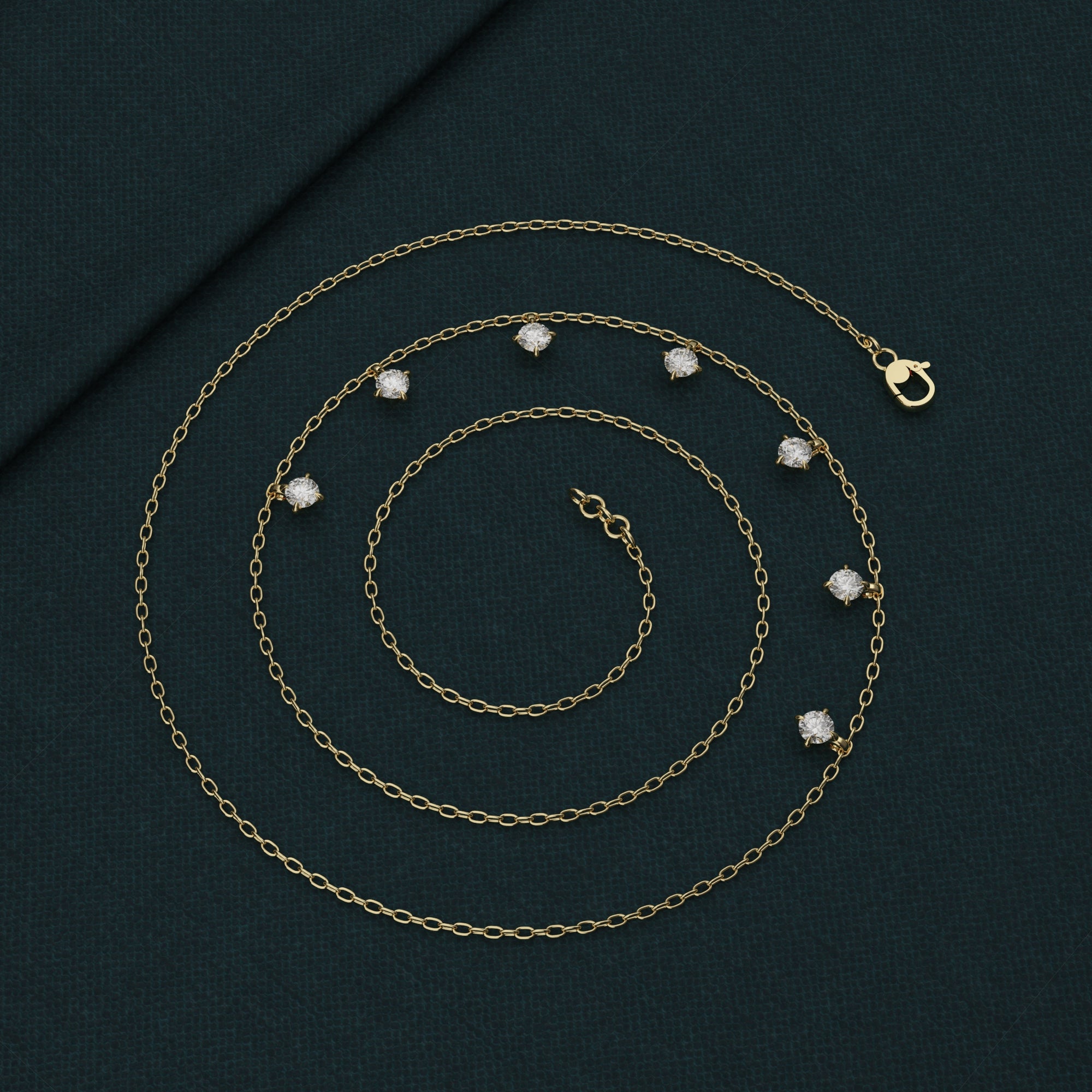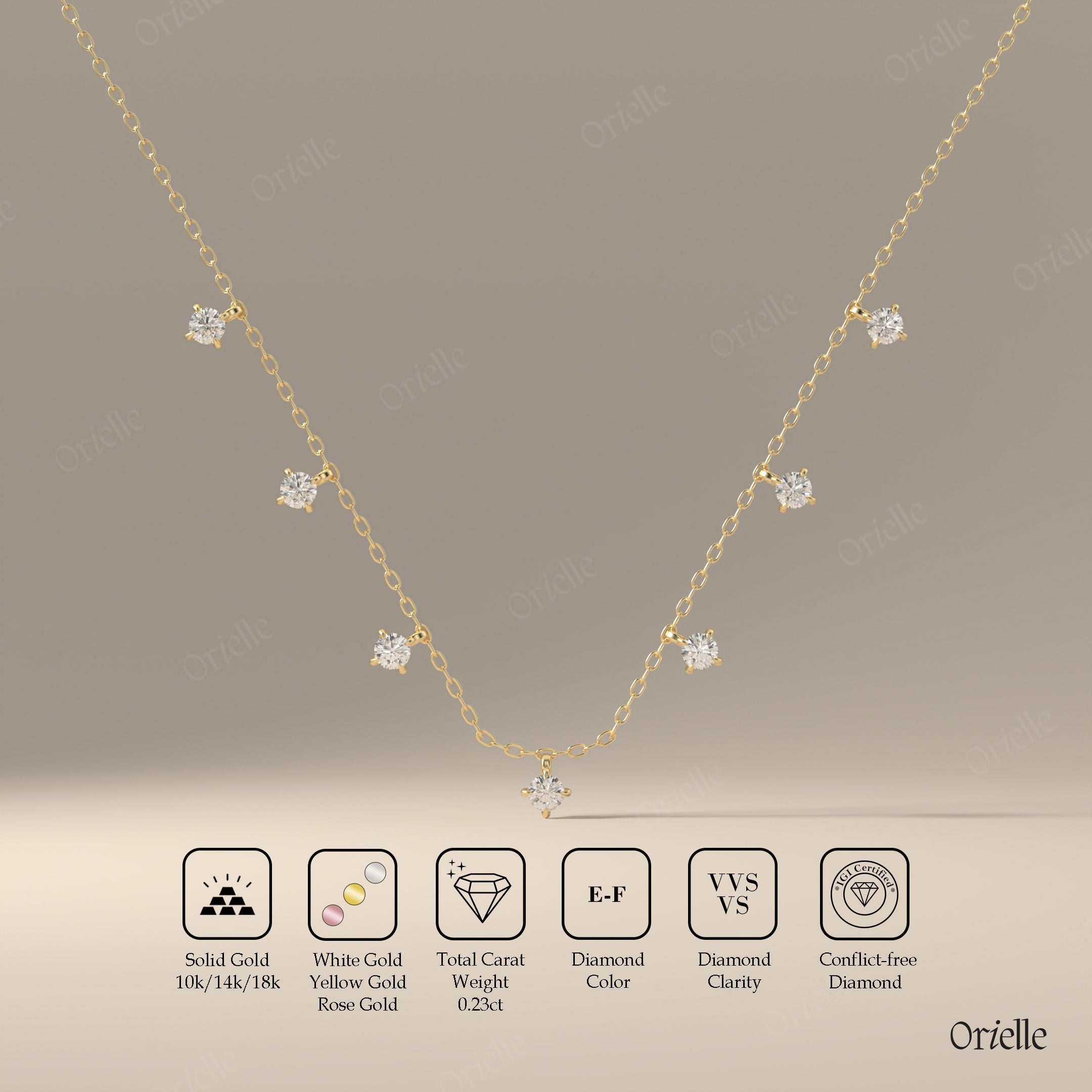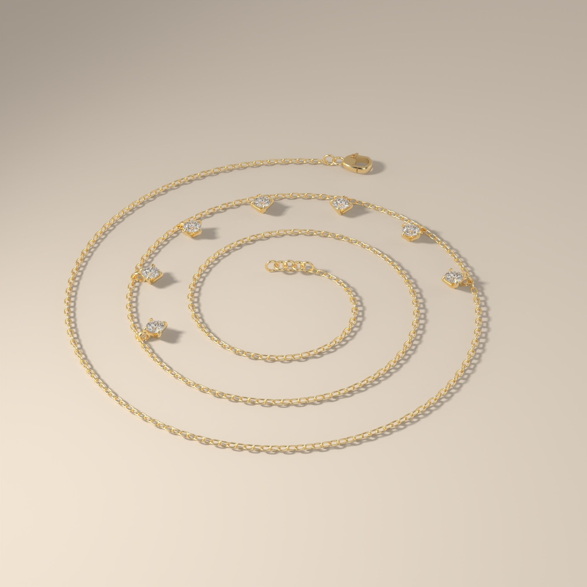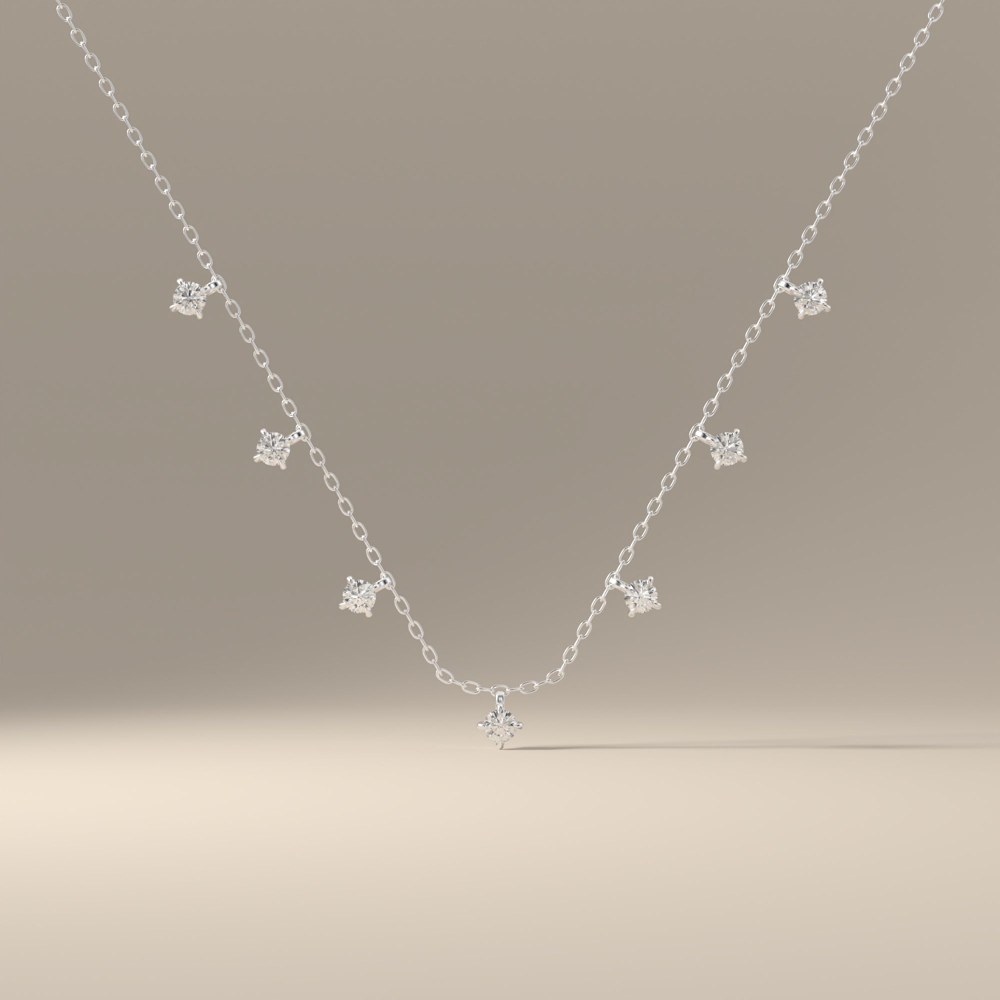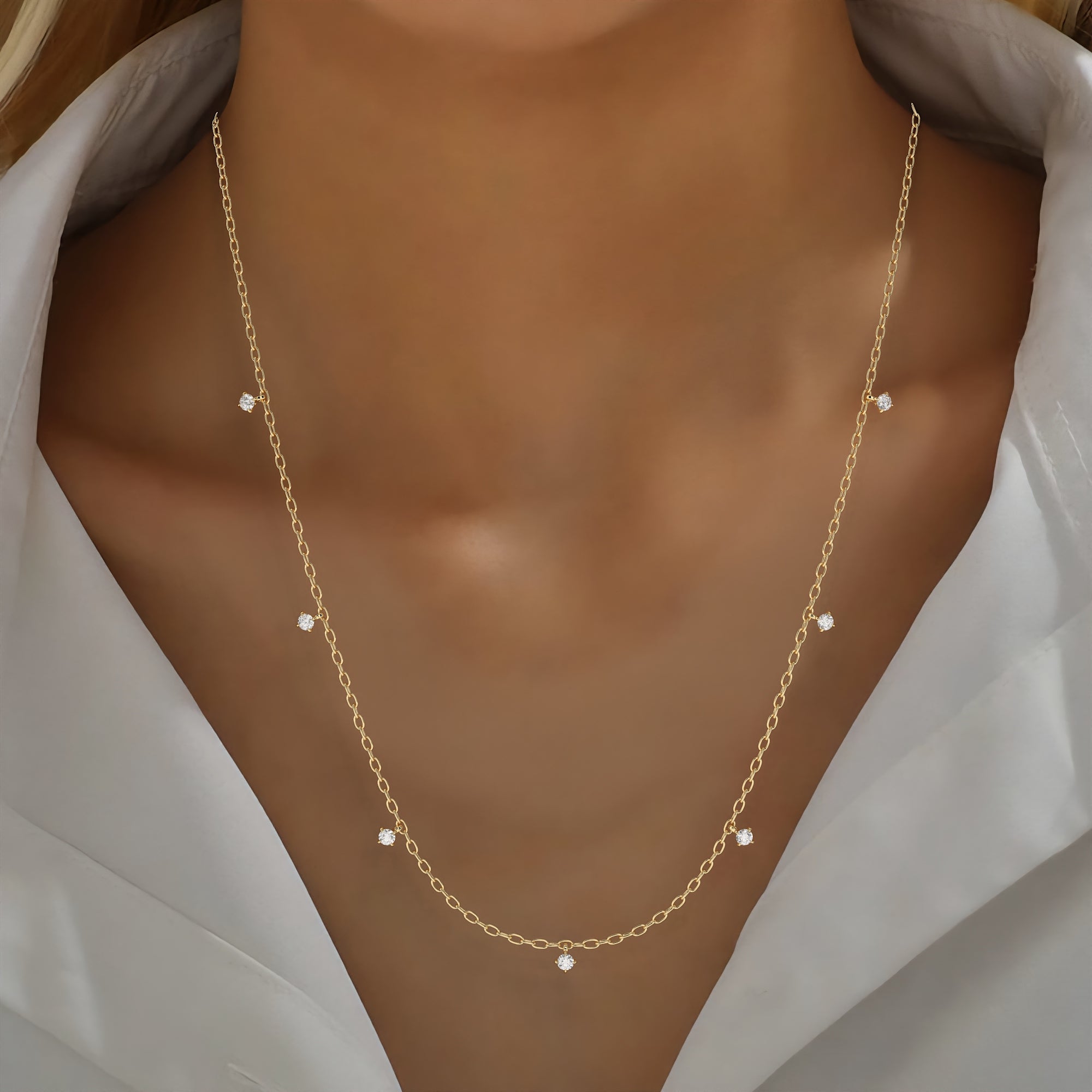 Delicately designed, this floating moissanite station necklace features sparkling stones set along a fine, solid 14K gold chain. Perfectly minimalist and effortlessly elegant, it complements any outfit—ideal for everyday wear or as a thoughtful, unique gift. Lightweight, durable, and exquisitely crafted for lasting beauty.